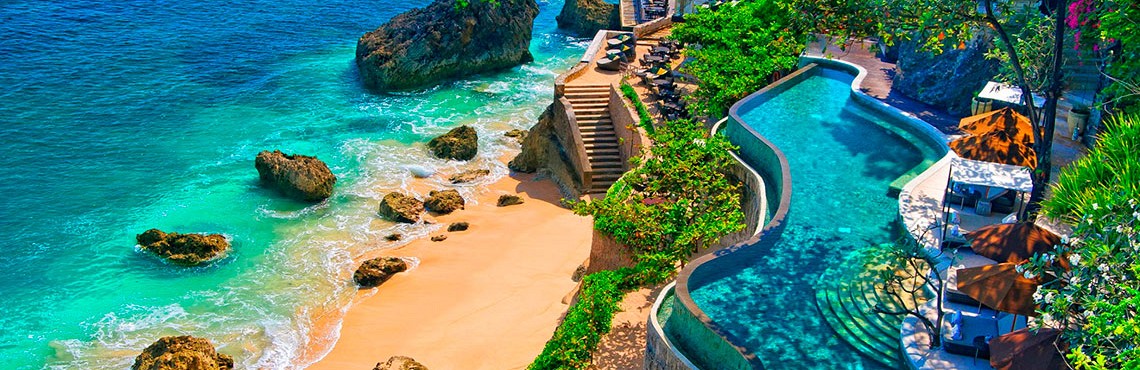 Бали – популярный курорт индонезийского острова, который находится в живописном месте мира. Архипелаг Лессер Сунда, соседство с островами Ява и Ломбок. Данное место по праву считается экзотическим раем: живописные зеленые рисовые поля, плантации, парящие вулканы, прохладные озера и быстрые реки, буйно зеленеющие леса и окаймленные пальмами пляжи.